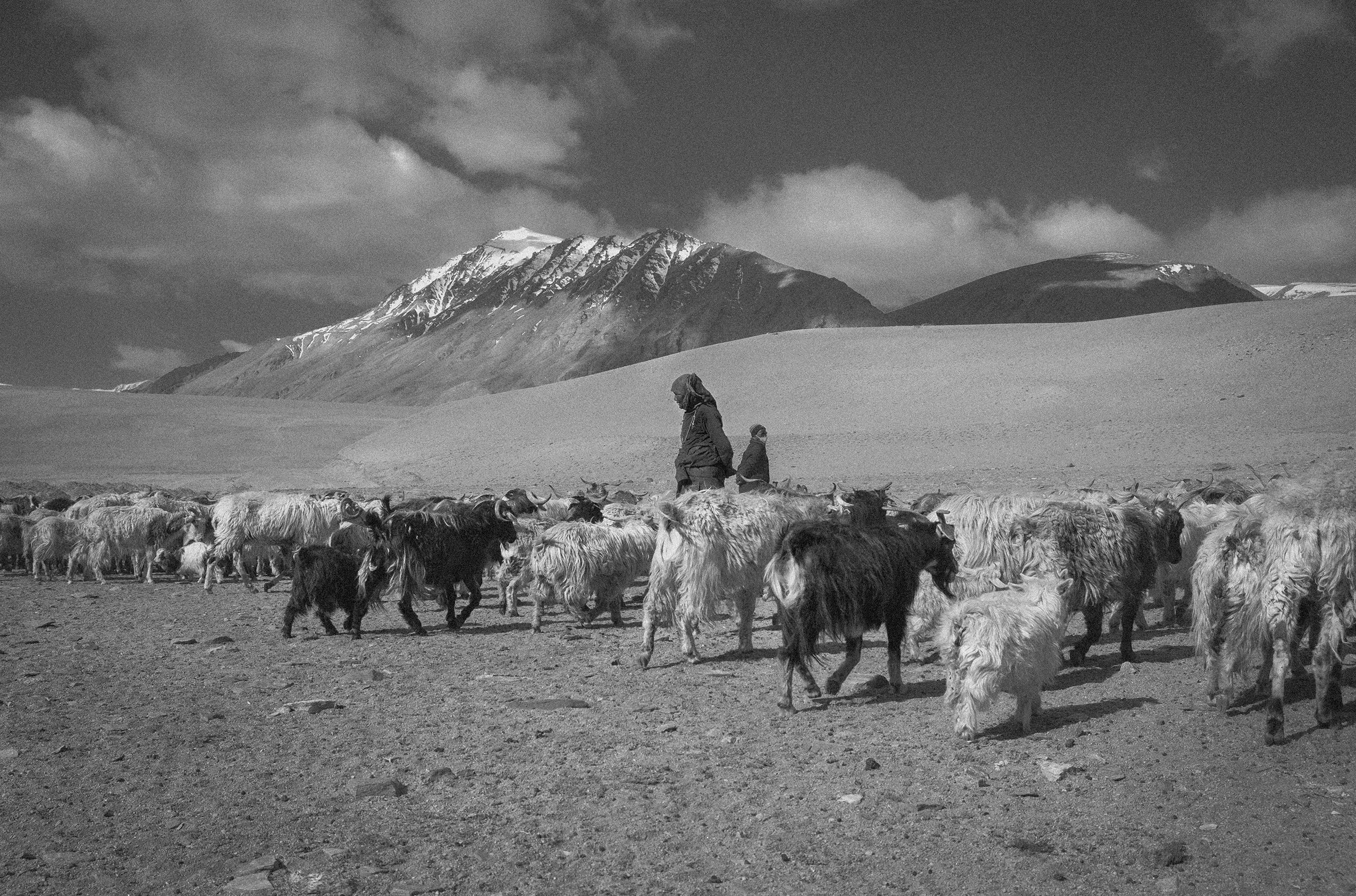 Our pashmina is collected at over 4’000 meters above sea level by herders in the Himalayan Changthang highlands. The delicate hair of the pashmina goat is carefully hand-combed to preserve quality and natural beauty, ensuring the finest wool while respecting the well-being of both humans and animals.